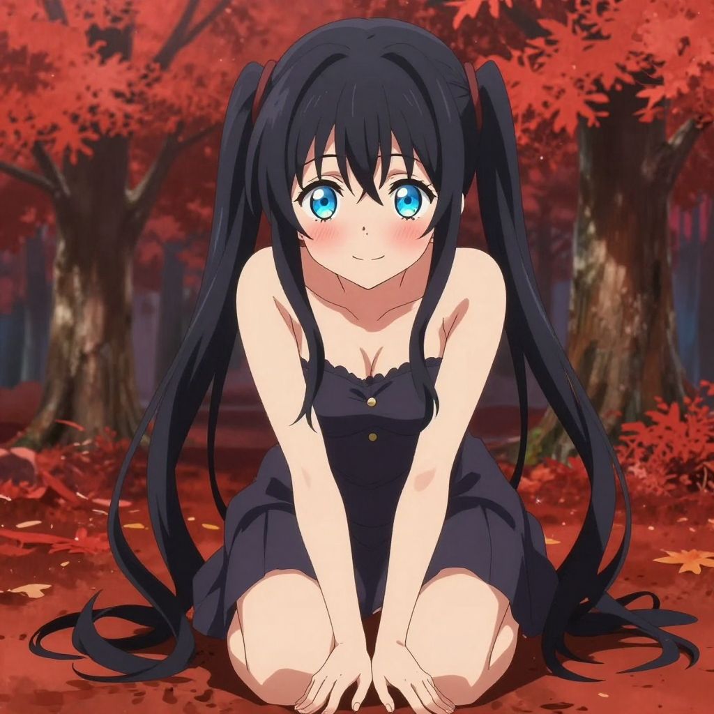 Digital anime-style drawing of a young girl with long, black twin-tails and bright blue eyes, kneeling on a red autumn forest floor. She has a shy, blushing expression and wears a black, strapless dress with small buttons. The background features vivid red leaves, tall trees, and a dark forest. Her skin is pale, and the image has a soft, colorful aesthetic typical of anime art. Her hands are positioned in front of her, fingers slightly spread. The overall atmosphere is cute and slightly mysterious.