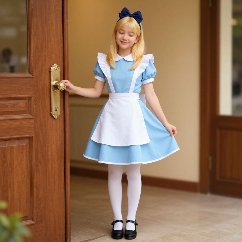 Alice wonderland doorknob, 1girl, solo, dress, blonde hair, mary janes, bow, hair bow, smile, blue dress, full body, shoes, closed eyes, standing, short sleeves