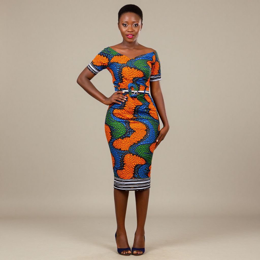 Woman modeling a vibrant African ankara dress featuring bold orange, blue, and green patterns, paired with navy high heels, striking a confident pose against a neutral background.