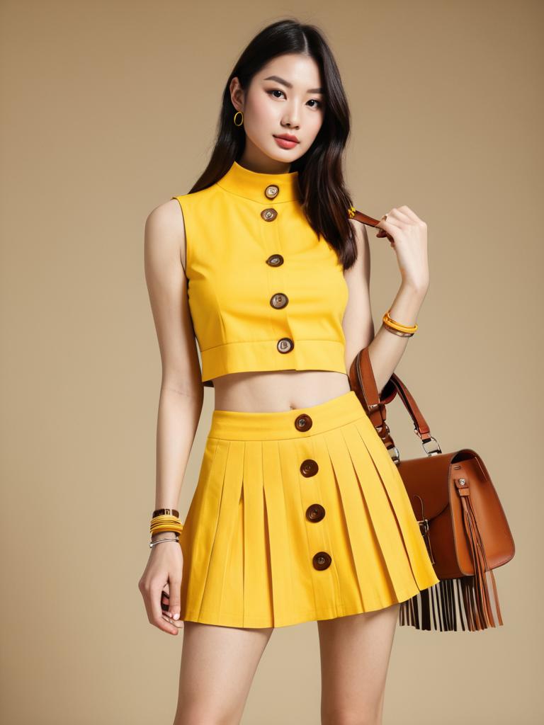 Woman, modern urban, high-neck sleeveless crop top in a neutral tone, A-line mini skirt in vibrant yellow with front button detail, long fringe brown leather satchel, minimalist bangle. --sref 1404