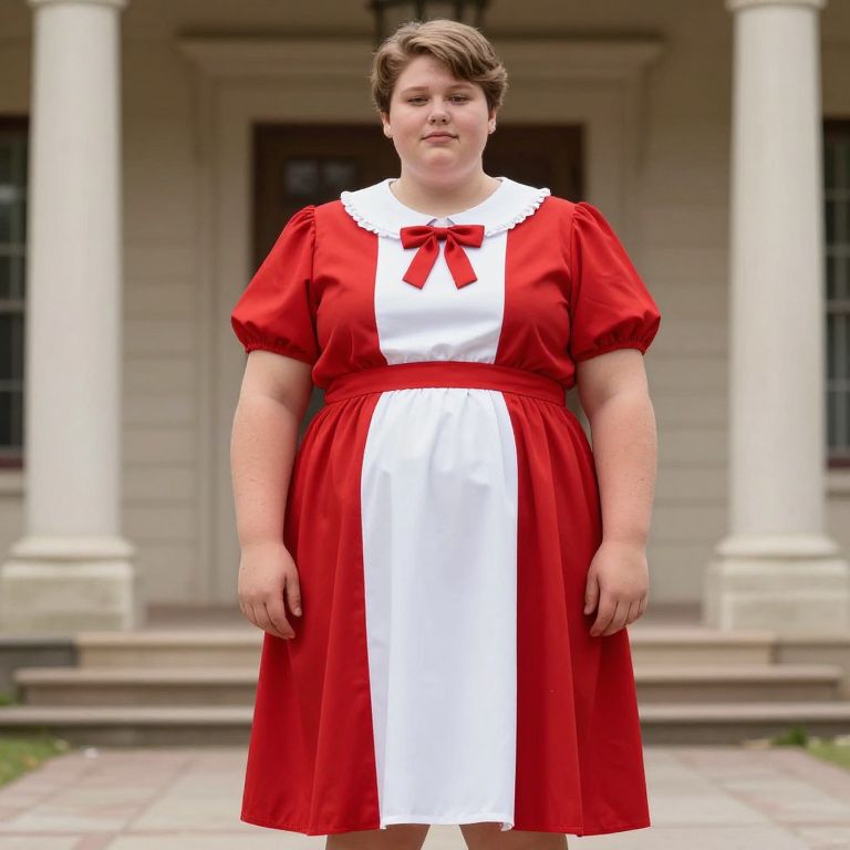Photograph of a plus-size woman with short brown hair, wearing a red and white maid dress with puffed sleeves, standing in front of a white