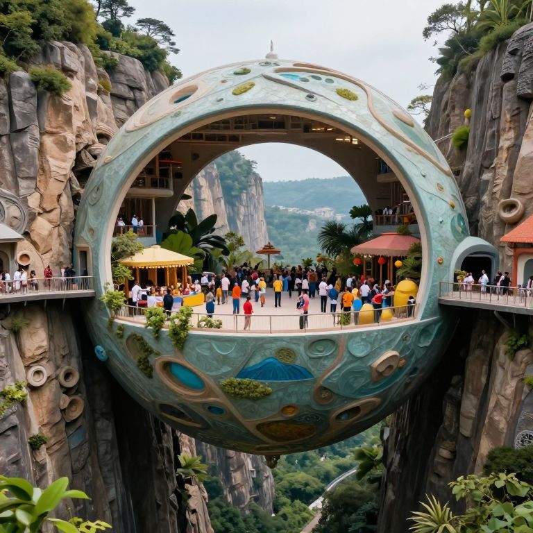 Photograph of an elaborate, futuristic, circular walkway suspended between two towering, rocky cliffs adorned with greenery. The circular structure, decorated with colorful, organic patterns, has a large open center where numerous people, dressed in colorful, casual clothing, walk and gather. Red and orange umbrellas and small buildings with traditional Asian-style roofs are scattered within the walkway area. The background reveals a lush, green valley with distant, hazy mountains. The image is vibrant, with a mix of natural and futuristic elements, creating a whimsical, immersive atmosphere.