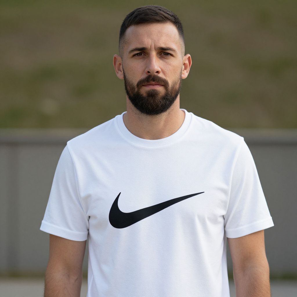 Photograph of a bearded, dark-haired man with a serious expression, wearing a white Nike t-shirt with a black Nike logo, standing outdoors in