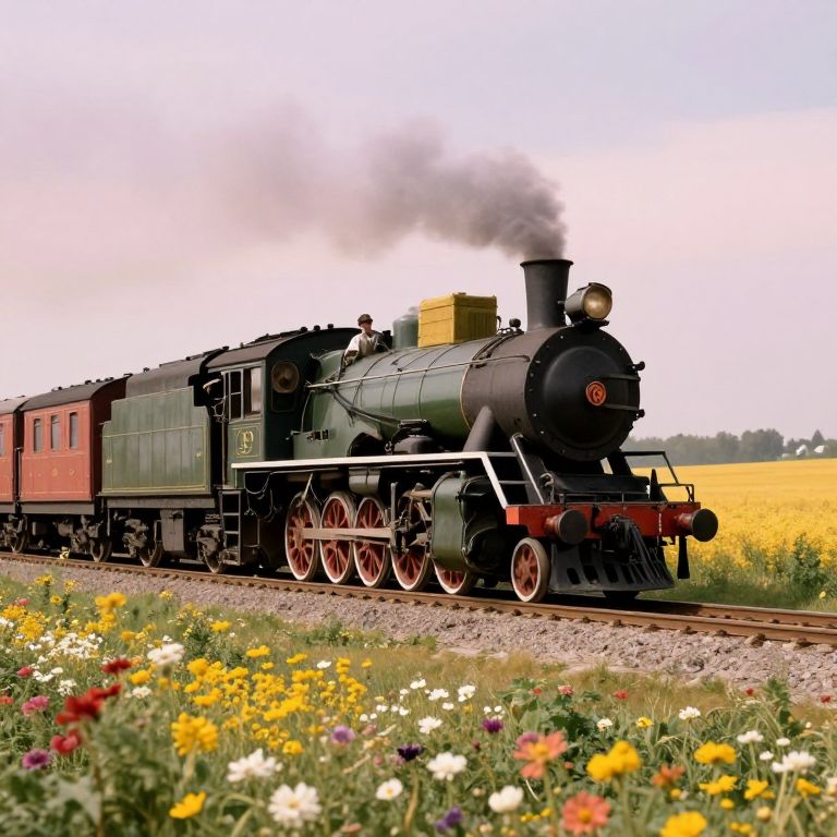 1910s vintage steam train traveling through countryside, surrounded by blooming wildflowers and golden fields under a soft pastel sky, detailed locomotive with classic design, workers in period uniforms loading cargo, soft light enhancing early 20th century industrial vibe