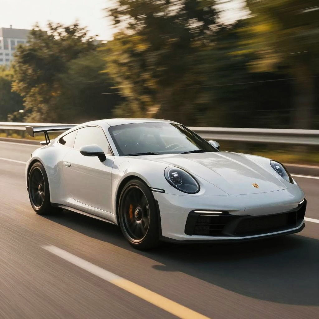 Photograph of a white Porsche 911 speeding on a sunlit highway, with blurred green trees and metal guardrail in background.
