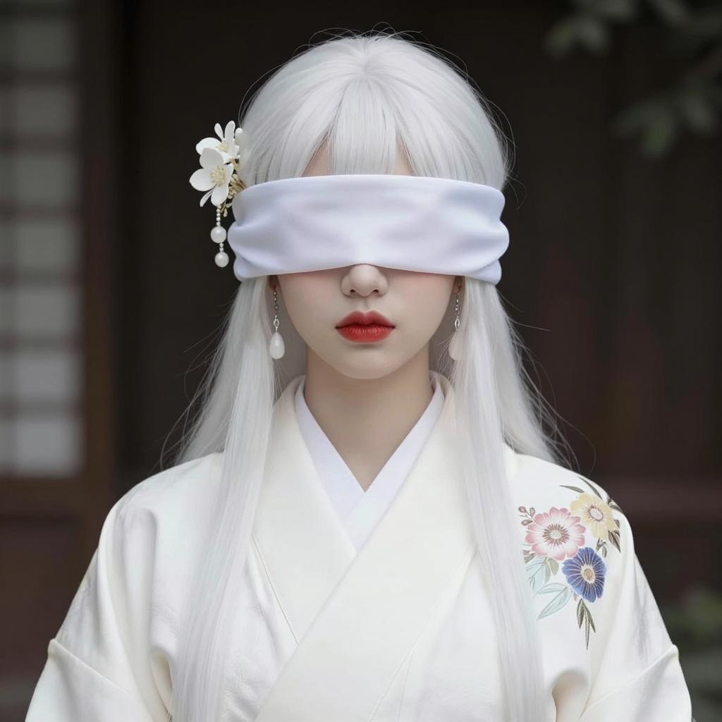 Digital illustration of a pale-skinned woman with long, wavy gray hair, wearing a black blindfold. She has red lipstick and a black, lace-trimmed dress with a gold chain belt. Her right hand is on her chest. She is facing slightly downward. Background is dark and blurred. Her expression is neutral.