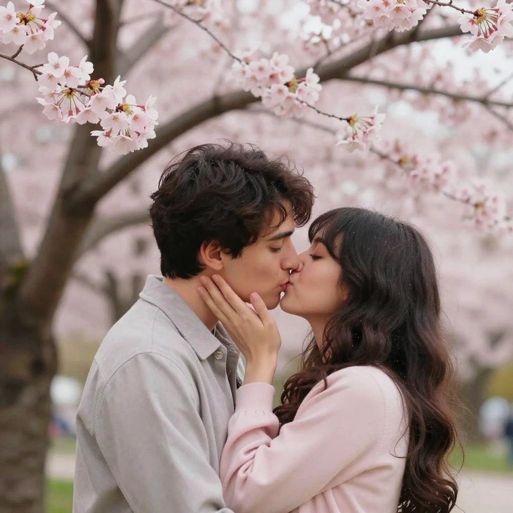 Latina kiss under blooming cherry blossom tree, spring season, gentle and affectionate moment, pastel color palette, cinematic lighting, high detail