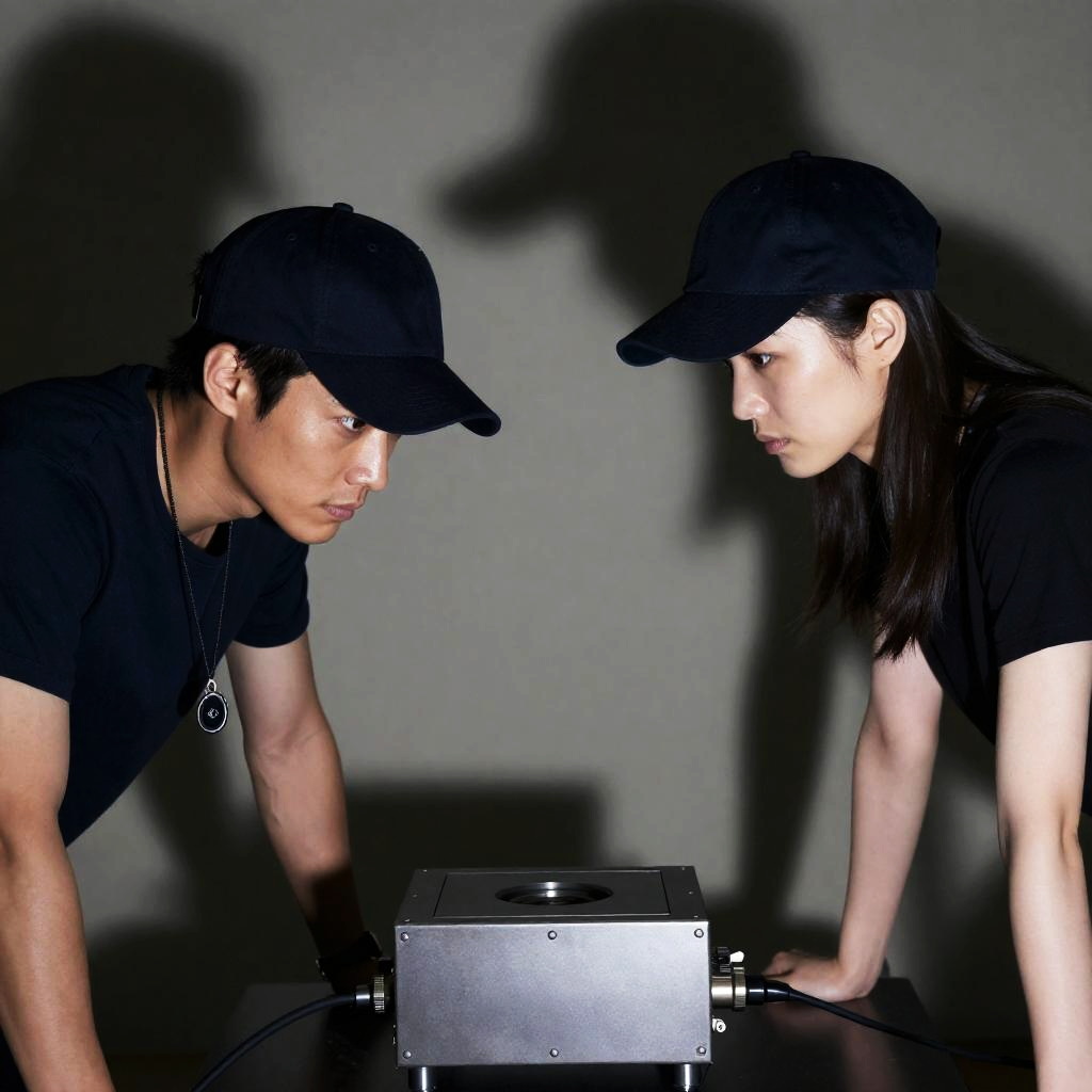 Photograph of two people in a dimly lit room. Both wear dark baseball caps and shirts. Man on left, slightly crouched, with pendant necklace, intense expression. Woman on right, leaning forward, focused. Central metallic device with cables. Shadows dominate background.