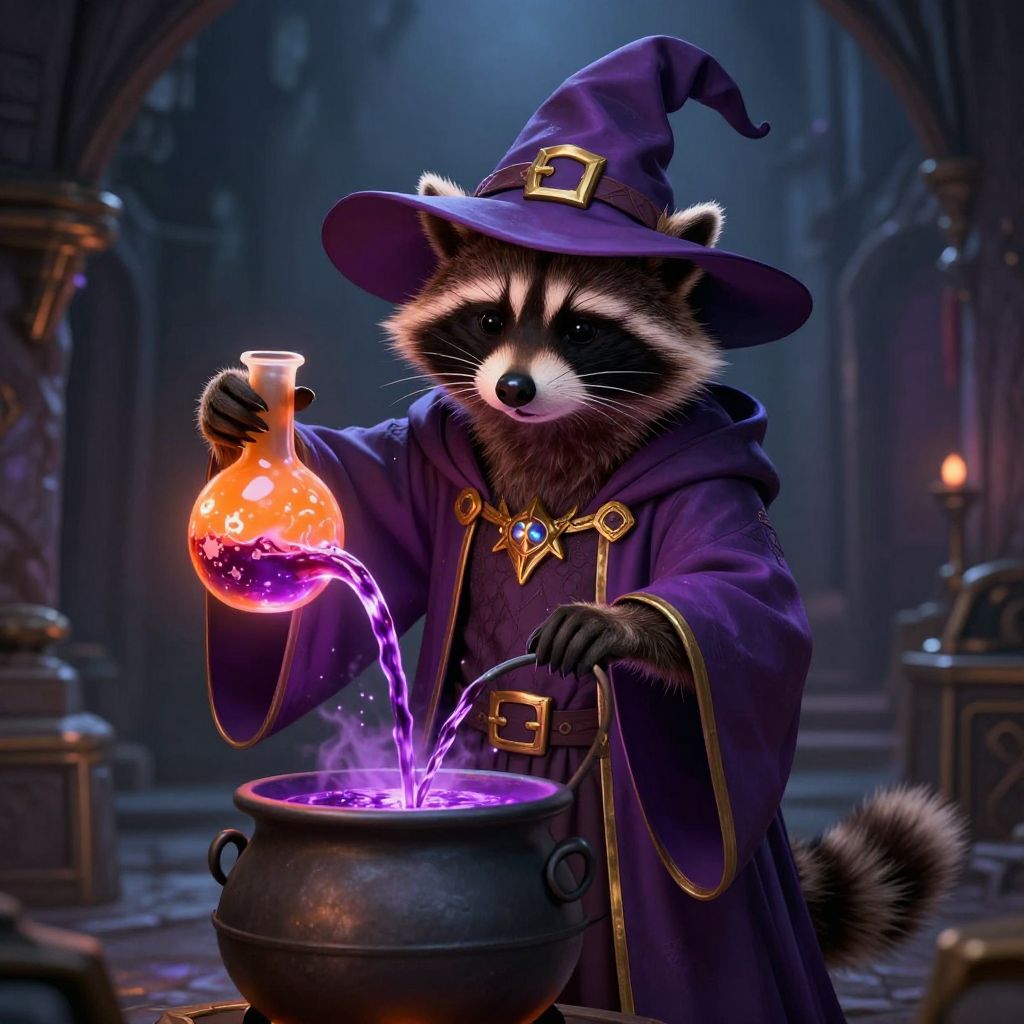 A detailed cinematic-style illustration of an anthropomorphic raccoon dressed as a wizard in a dark medieval alley. The raccoon wears a purple wizard hat and robe adorned with gold accents, holding a glowing orange flask in one hand while pouring a vibrant purple potion from a magical vessel into a cauldron. The scene is illuminated with dramatic volumetric lighting, evoking a mystical and enchanting atmosphere.