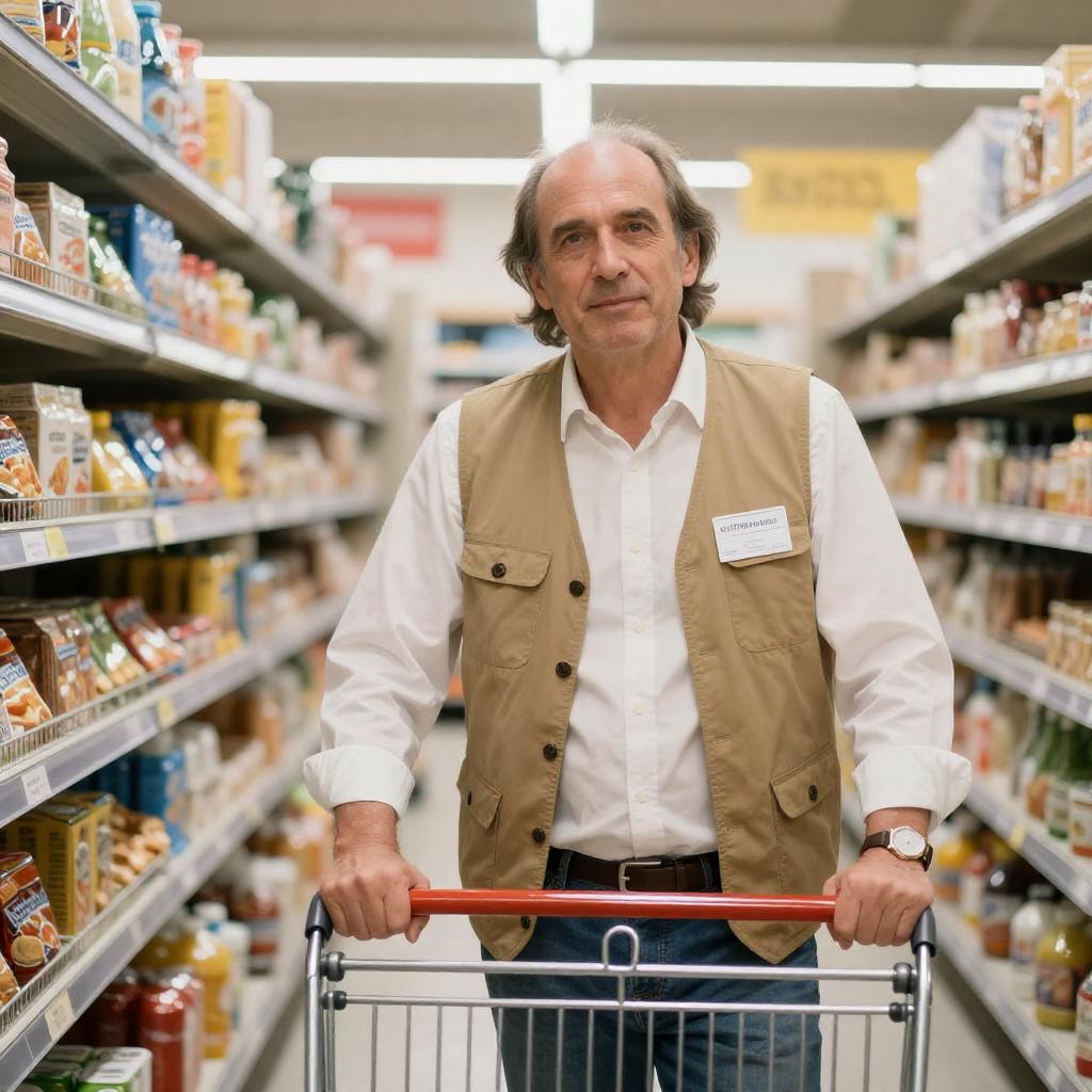 Photograph of a middle-aged man with a balding head and long brown hair, wearing a beige vest over a white shirt, standing in a brightly lit grocery store. He holds a wooden broom diagonally across his body. Behind him, shelves are stocked with blue boxes of Light & Saucy chicken products, featuring images of people in black vests. The store has fluorescent lighting and organized shelves in the background.