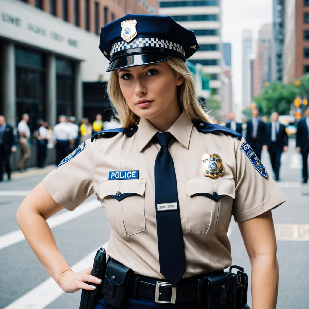 Photorealistic image of a blonde female police officer standing confidently on a city street during daytime. She is wearing a beige uniform with a black tie, black belt with holster, and a black police cap featuring a badge. The photo captures a professional look with detailed clothing, a stern expression, and blue eyes. The background shows blurred pedestrians and tall buildings, emphasizing an urban environment with natural light.