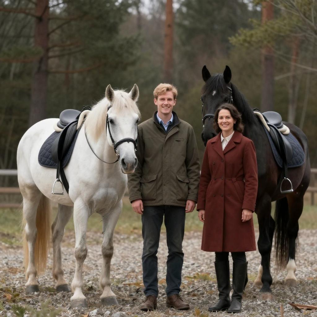 Photograph of three people and two horses in a forest clearing. White horse with black saddle on the left, black horse with saddle on the right. Man in green jacket, blond hair, center, smiling. Woman with dark brown hair, red-brown coat, right, smiling. Gravel ground, sparse vegetation, and trees in background.