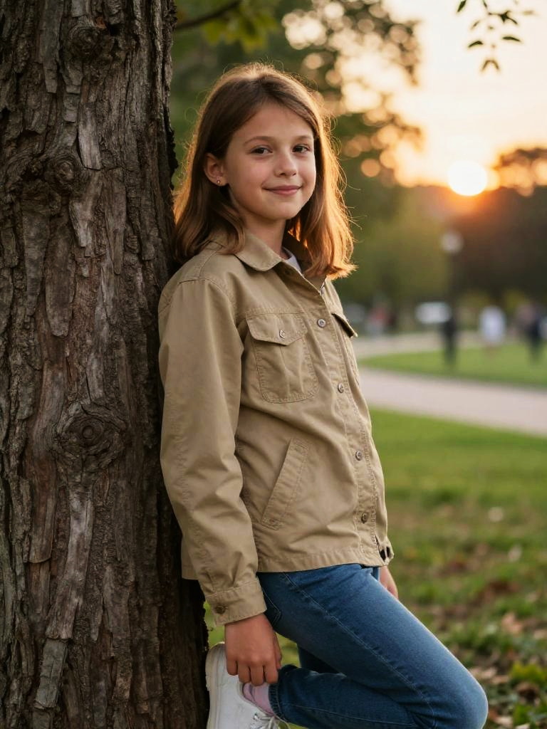 Portrait of a 9-year-old girl with olive skin and light brown hair leaning casually against a large tree trunk in a park during early evening. She is wearing a khaki utility jacket and blue jeans, smiling gently at the camera with a warm golden-hour sunset glow in the background and blurred greenery surrounding her.