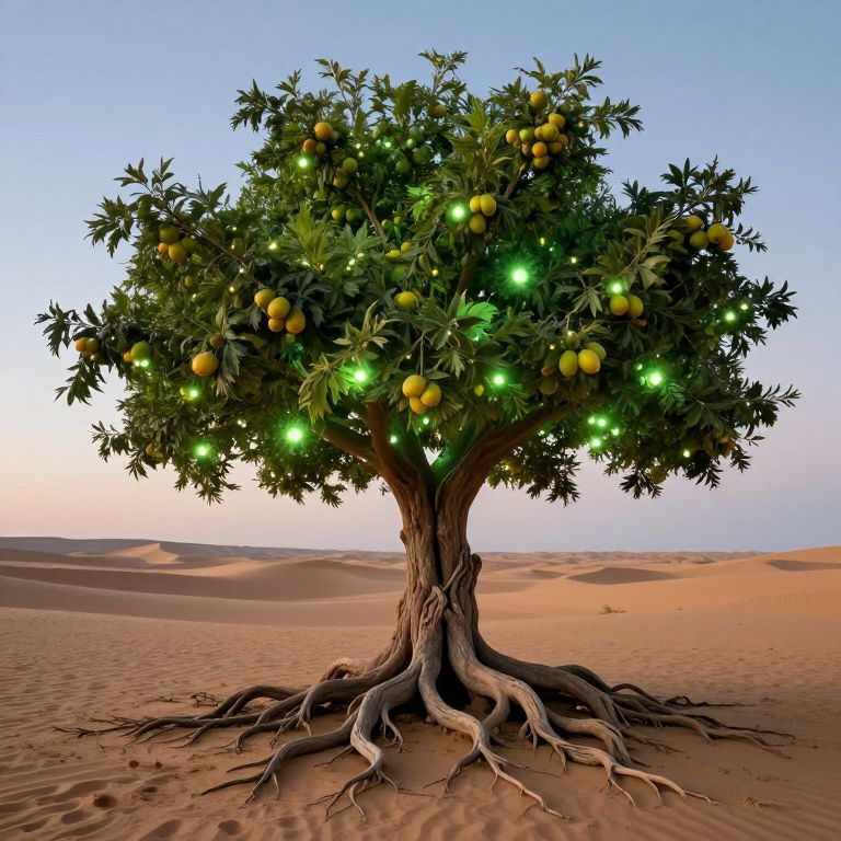 A lush, vibrant tree laden with glowing fruits stands defiantly in a barren desert landscape, its roots sprawling deep into the sand as if defying the laws of nature.