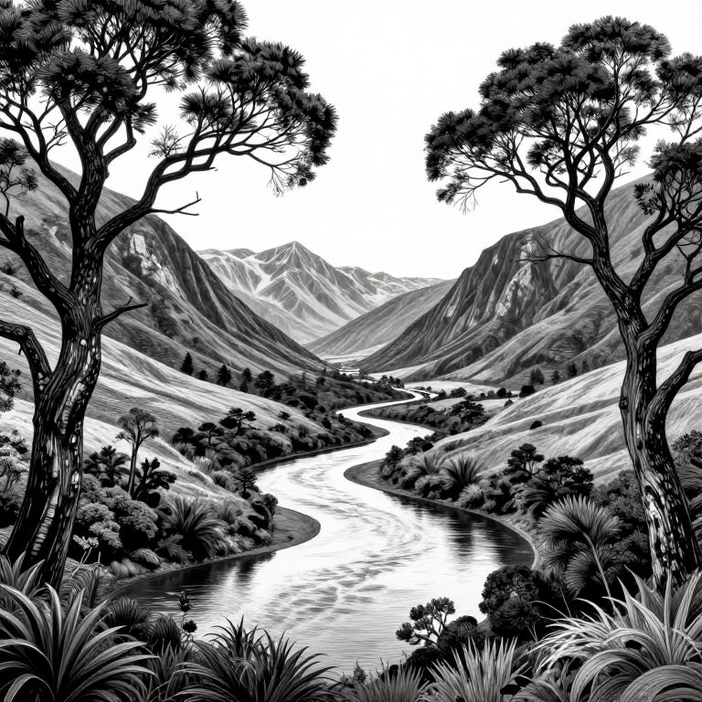 The image depicts a highly detailed, intricate black-and-white illustration of a New Zealand landscape, rendered in a woodcut style with an inverted liquidation effect. The scene is rich with texture and depth, showcasing a mountainous terrain with rolling hills and a winding river. Two prominent trees frame the composition, one on the left and the other on the right, their branches reaching out towards the viewer. The river flows gracefully through the valley, reflecting the surrounding landscape. The overall composition is balanced, with the trees and mountains creating a sense of symmetry and harmony. The high resolution and photo-realistic quality of the image capture the essence of the natural environment, making it appear almost three-dimensional. The interplay of light and shadow, as well as the intricate details in the foliage and rock formations, add to the realism and depth of the scene.