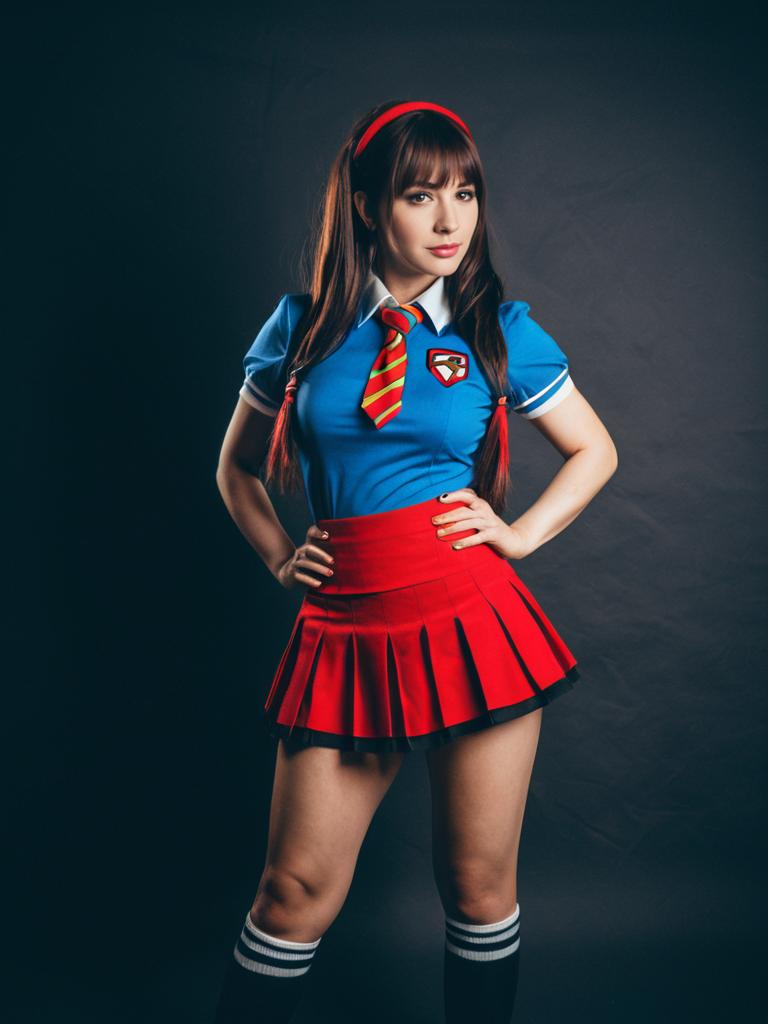 Woman in Mini Skirts costume, photorealistic cosplay photography, cinematic realism