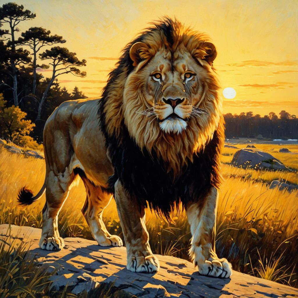 Highly detailed oil painting of a fierce lion standing on a rock in a sunlit savanna during golden hour. The lion has a thick, dark mane with golden highlights accentuated by warm lighting. The background features tall grasses, scattered rocks, trees, and a setting sun, evoking an American Romanticism style similar to the works of Winslow Homer and Frederic Remington.