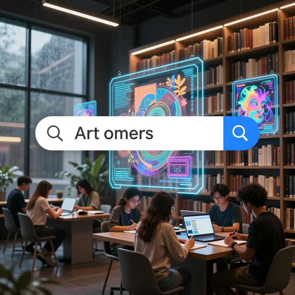 AI art search in a sleek cyberpunk library, holographic books and AI-generated paintings projected around, neon-lit environment with rain outside, a diverse crowd interacting with the AI tools to explore new artistic styles and concepts