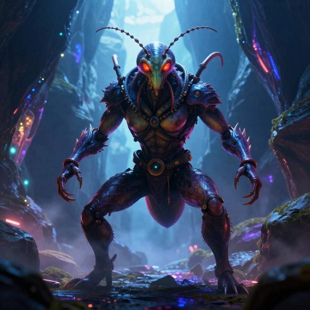 In a aurora-lit glacial plateau, a colossal antlered mammoth guardian with rune-etched tusks emerges, crafted in the enchanting style of Renaissance oil painting. This creature assumes a powerful battle stance, its expressive, human-like eyes reflecting determination amidst a vibrant array of colors.