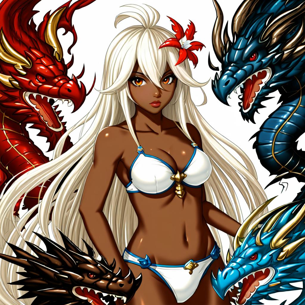 Zooey (granblue fantasy), granblue fantasy, 1girl, dark-skinned female, red eyes, hair between eyes, white hair, very long hair, long hair, ahoge, hair flower, medium breasts, cleavage, navel, collarbone, white bikini, bare shoulders, dragon, by artist yano toshinori, anime