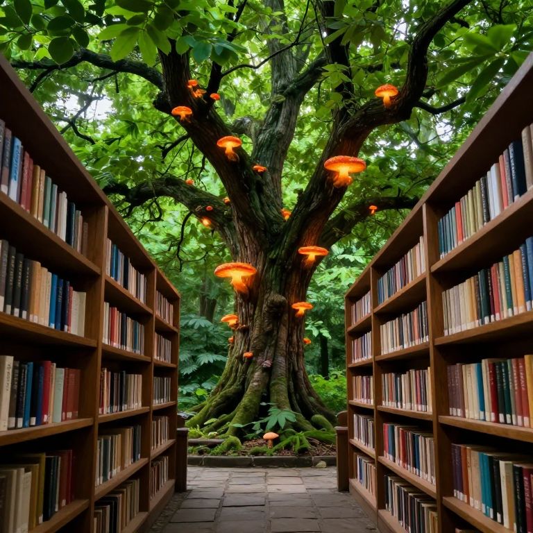 Books line wooden shelves flanking a vibrant green tree that towers over a stone pathway, its branches adorned with glowing orange mushrooms and surrounded by lush foliage, creating a mystical library where nature intertwines with knowledge.