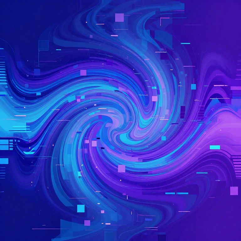 Digital abstract art featuring swirling blue and purple neon waves with glowing rectangles and lines, creating a dynamic, cybernetic vortex effect.