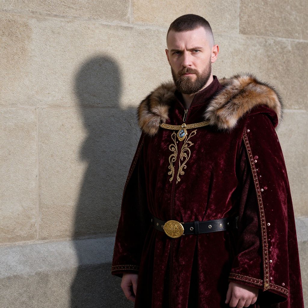 A serious, bearded man with a buzz cut stands against a stone wall, wearing a dark red velvet robe with gold embroidery and a fur-lined hood. The robe is fastened with a black belt featuring a gold buckle. His shadow falls to the left, contrasting with the bright, focused light on his face. The overall vibe is medieval and regal.