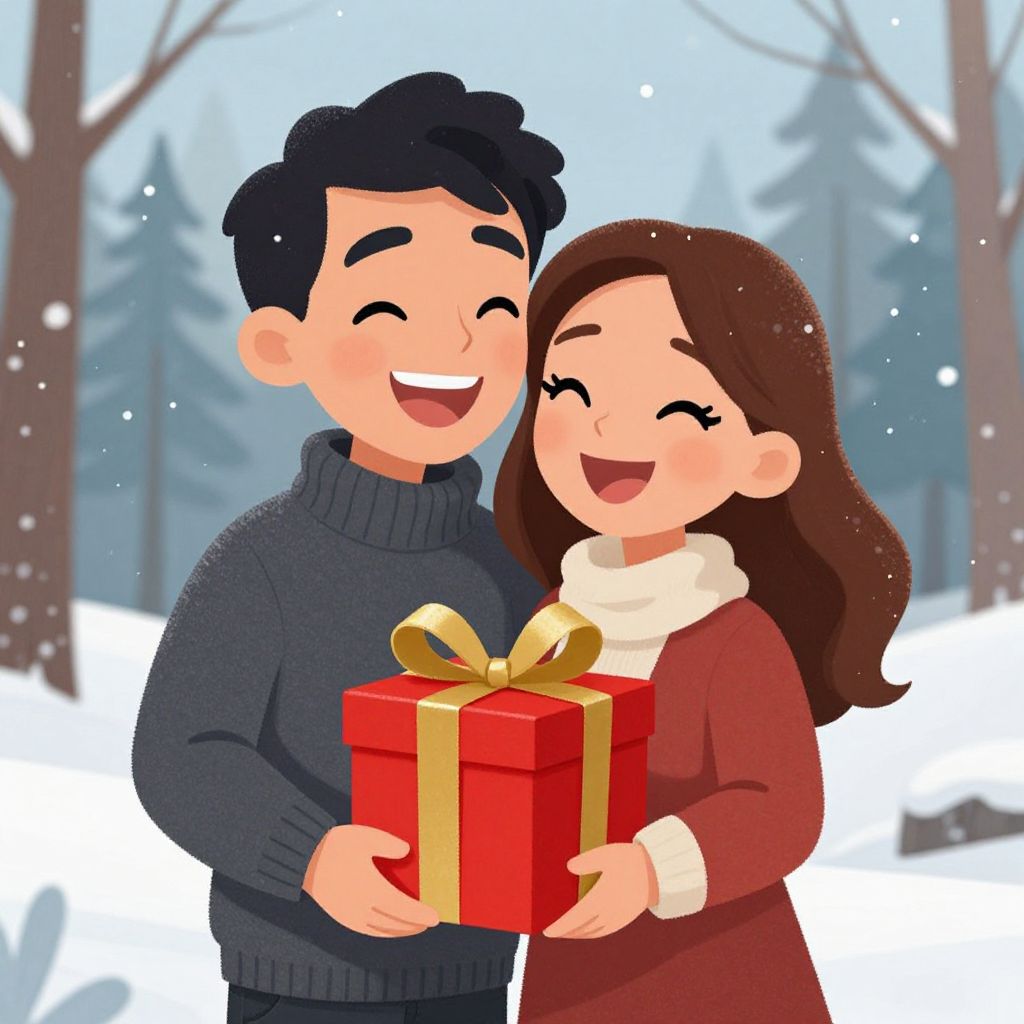 Digital drawing of a smiling couple in a snowy forest. The woman, with medium-length black hair, wears a brown sweater and skirt, and the man, with short brown hair, wears a dark green sweater and blue pants. She holds a red gift box with a gold ribbon, while he hugs her from behind. Snowflakes fall gently around them, and blurred trees and snow-covered ground form the background. The couple's expressions are joyful, and the overall style is cartoonish with bright, cheerful colors.