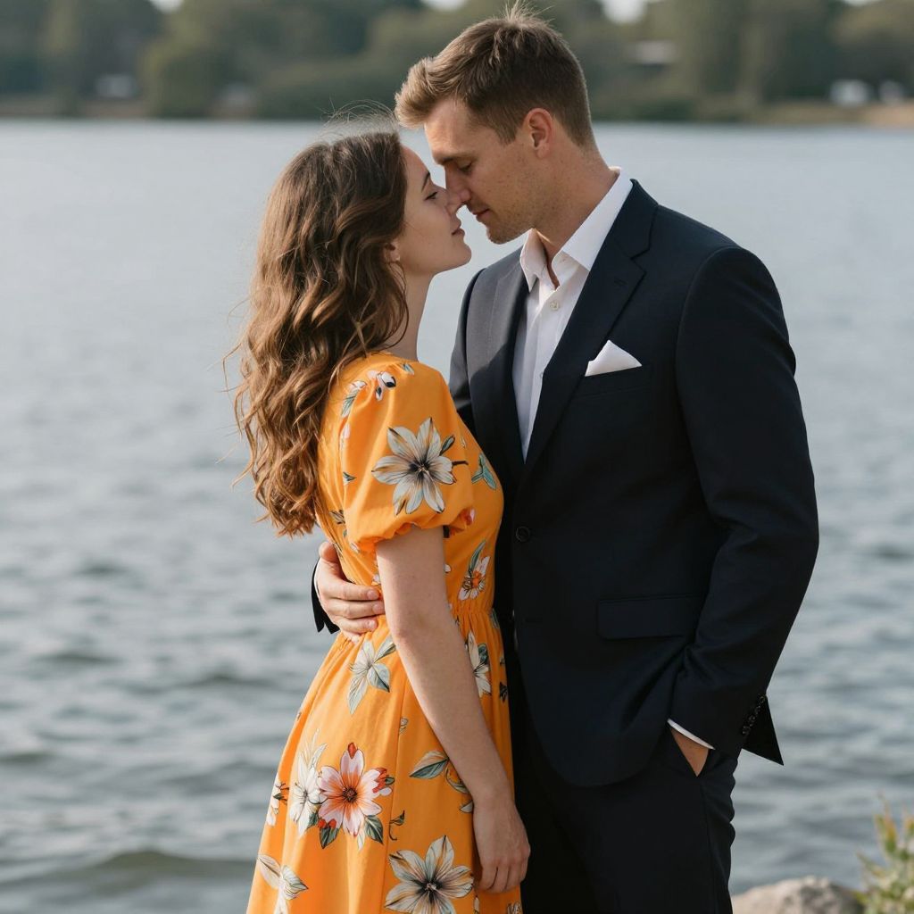 Romantic couple sharing an intimate moment by a serene lake, with the woman wearing a vibrant orange floral dress and the man dressed in a classic dark suit with a crisp white pocket square.