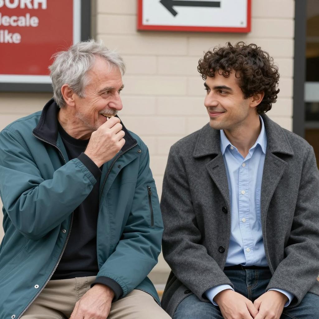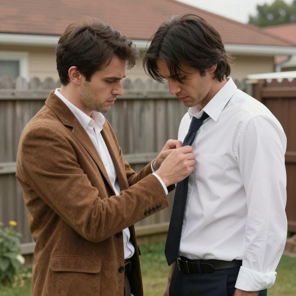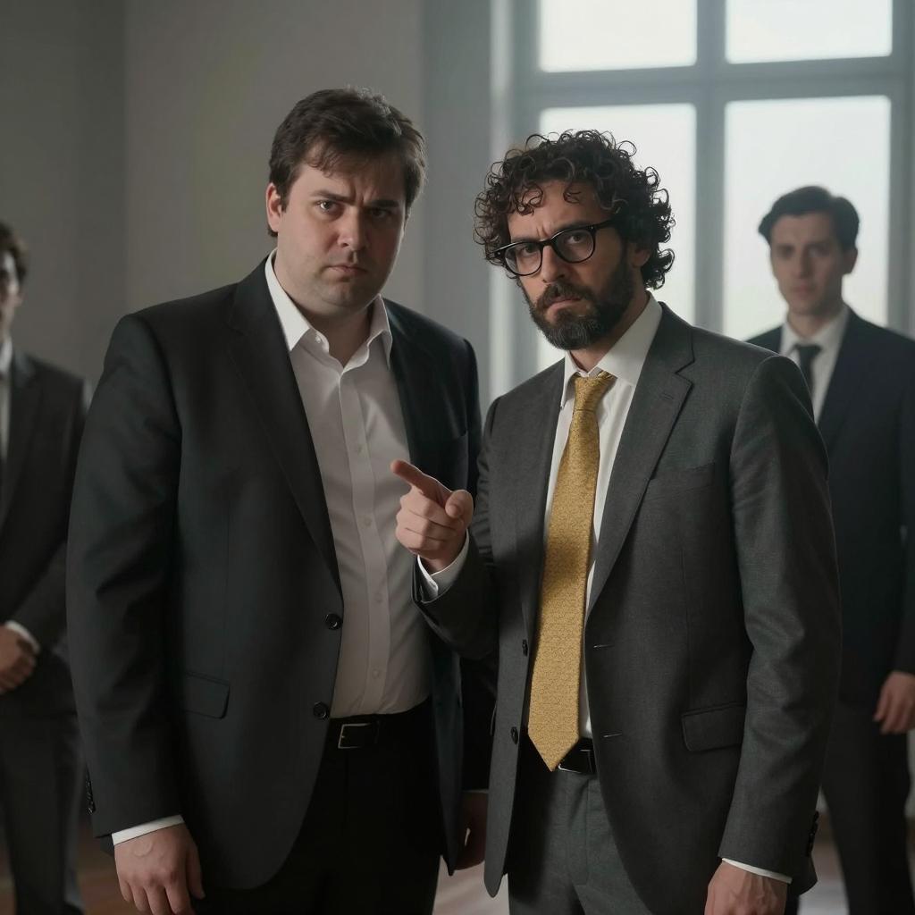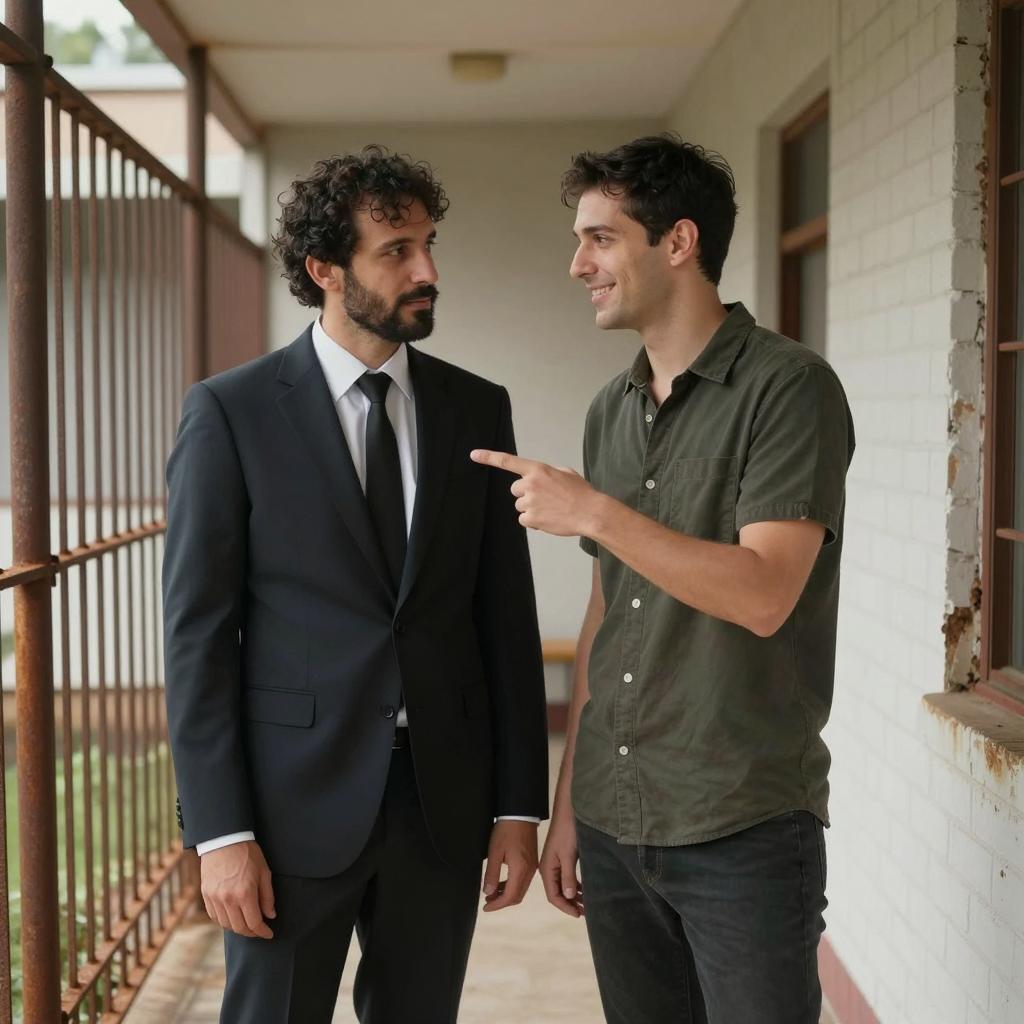 Two men stand in an outdoor corridor with a rusted metal fence and chipped white brick walls. The man on the left has curly hair, a beard, and wears a dark suit with a white shirt and black tie. The man on the right has short dark hair, a clean-shaven face, and wears a dark green short-sleeve shirt. The man on the right points with his right index finger while smiling at the man on the left, who smiles back. Both men are standing upright.