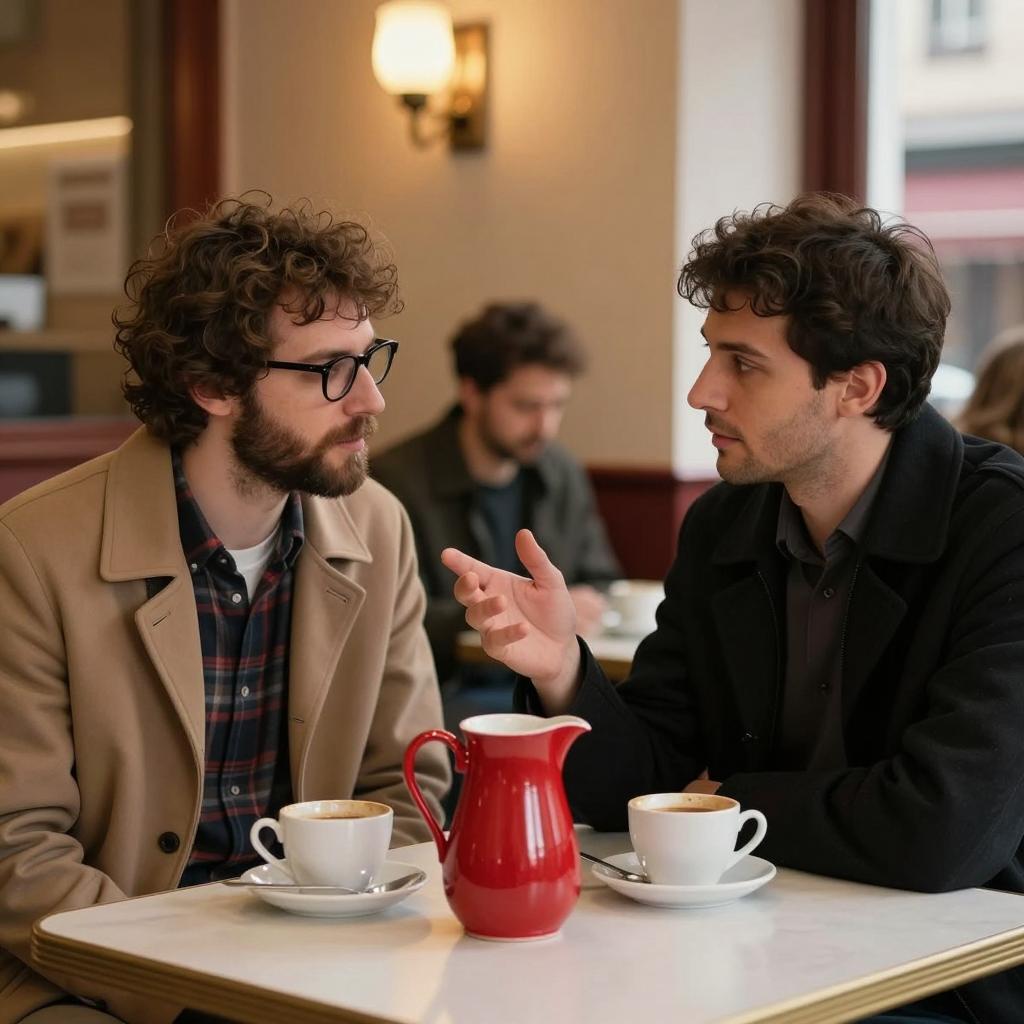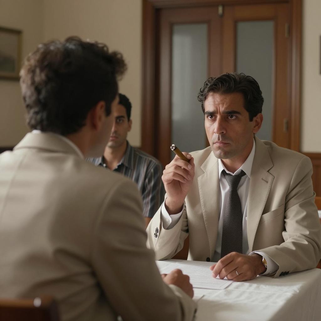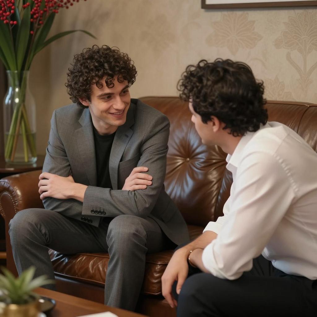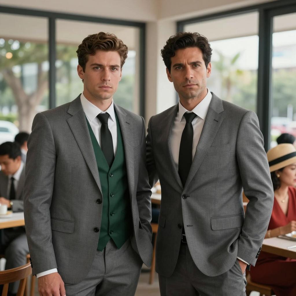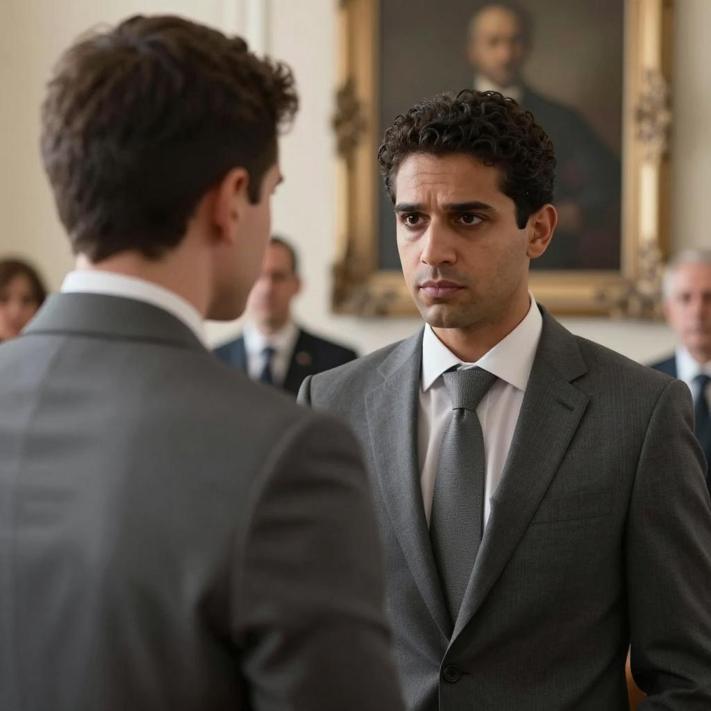Two men stand in an outdoor corridor with a rusted metal fence and chipped white brick walls. The man on the left has curly hair, a beard, and wears a dark suit with a white shirt and black tie. The man on the right has short dark hair, a clean-shaven face, and wears a dark green short-sleeve shirt. The man on the right points with his right index finger while smiling at the man on the left, who smiles back. Both men are standing upright.