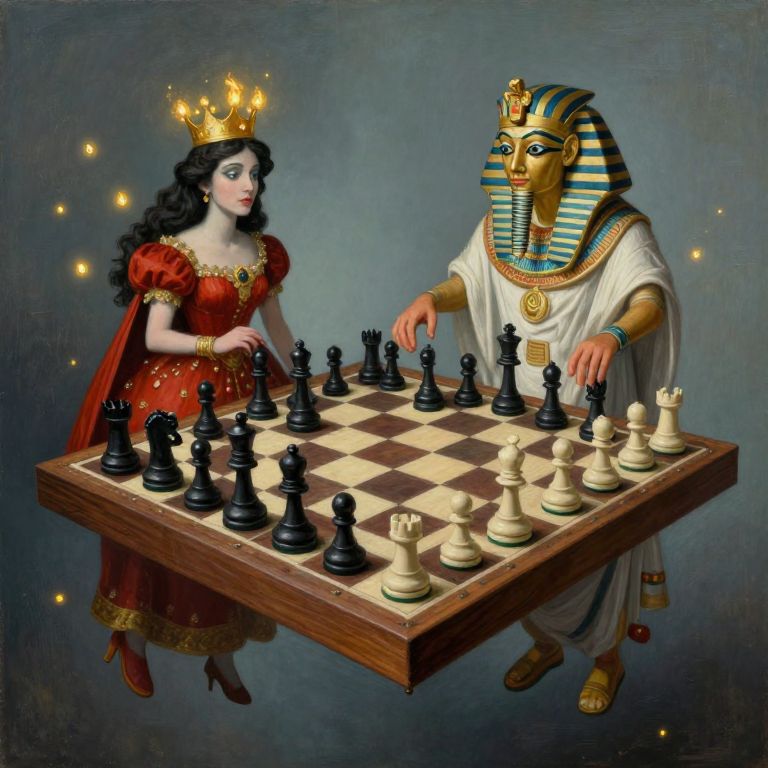 Craft an image reminiscent of surrealistic painting, depicting a chess game unfolding on a colossal floating board suspended in mid-air. The chess pieces are personified with exaggerated features and whimsical elements; a queen adorned with a crown of glowing fireflies and a bishop resembling an ancient Egyptian pharaoh among them. Capture the scene from a distinctive 'bug's-eye view', conveying a spectrum of emotions ranging from suspenseful anticipation to exhilaration as the players make their moves, creating a sense of playful curiosity within this dreamlike realm where reality intertwines with fantasy.
