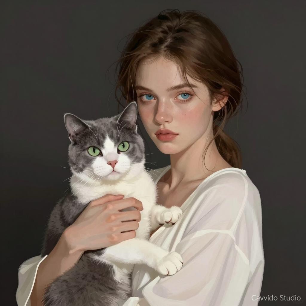 Illustration of a young girl with long, wavy blonde hair, wearing a red, ornate hat with feathers, and a ured, grayish-green dress. She holds a white kitten with blue eyes and a pendant necklace. The background is a ured gray. The girl's expression is intense and slightly melancholic. She is in a three-quarter view, facing forward. The kitten is in her left arm, looking directly at the viewer. The girl's right hand is partially visible.