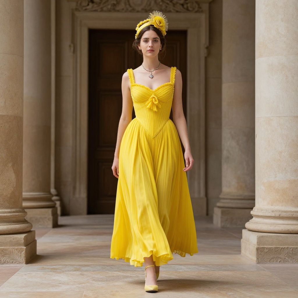 Photograph of a young woman with fair skin and dark brown hair, wearing a vibrant yellow, floor-length, sleeveless dress with a gathered bodice and a bow at the center. She accessorizes with a yellow feathered headpiece and yellow shoes. Her makeup is subtle, emphasizing her natural features. She walks down a grand, stone-columned corridor with a dark wooden door in the background. The light in the image is soft, highlighting the textures of the stone and her dress. The overall style is elegant and classic, reminiscent of a fashion runway show.