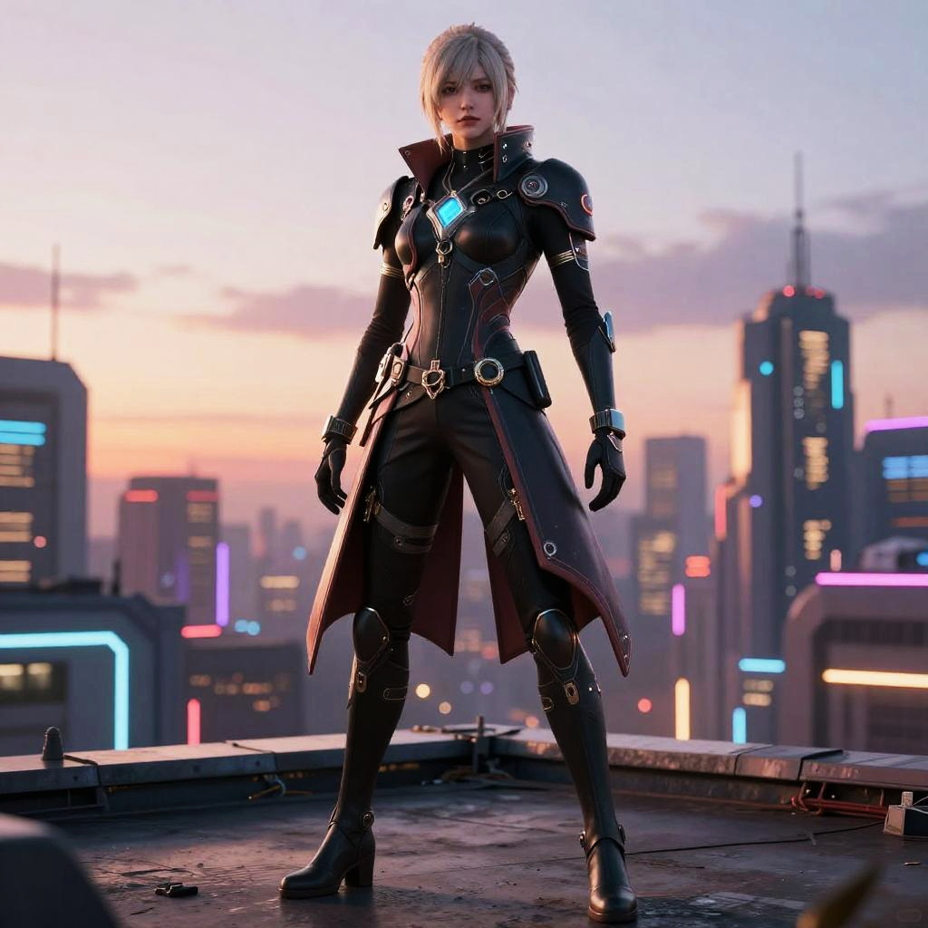 Male characters with short blonde hair standing confidently in a futuristic cityscape, wearing sleek armor with neon accents, dramatic lighting, high detail, cinematic atmosphere, digital art style.