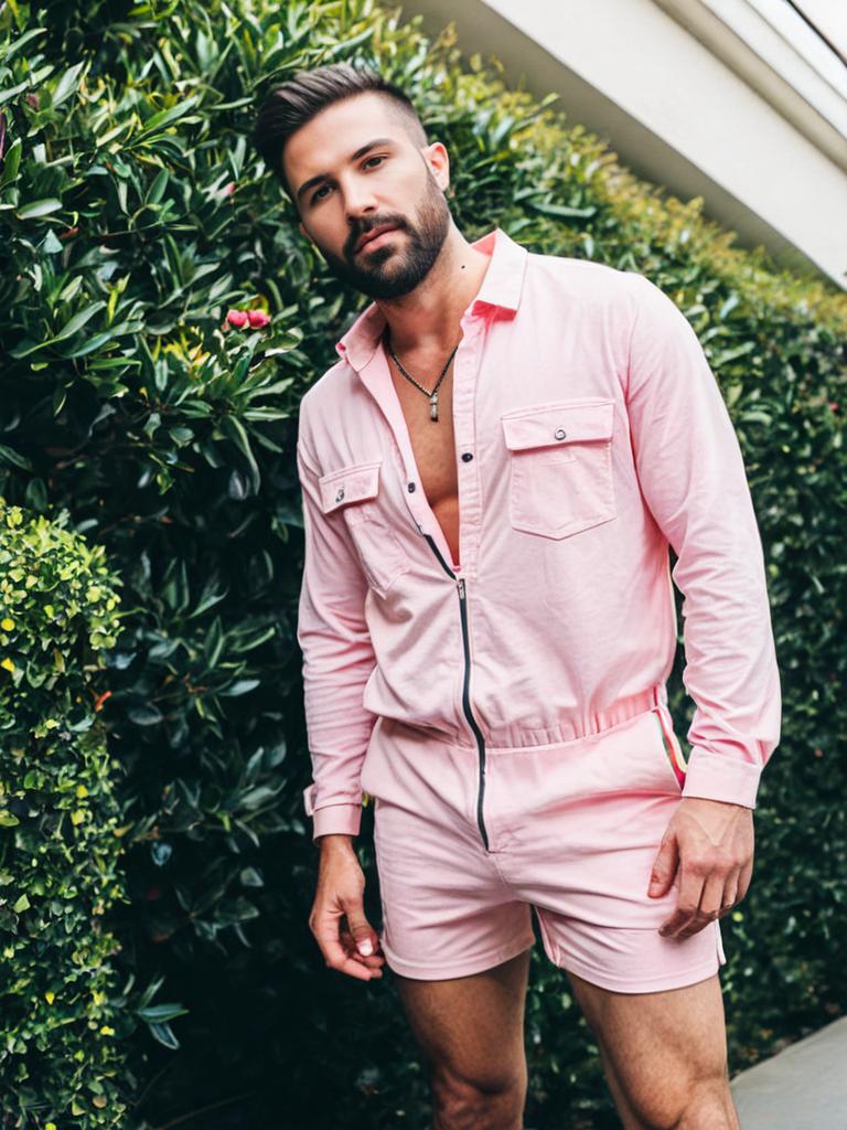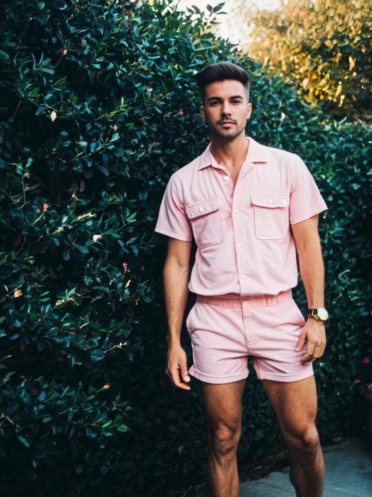 Pink Man Romper, man in pink shirt and shorts standing in front of bushes --sref 1399