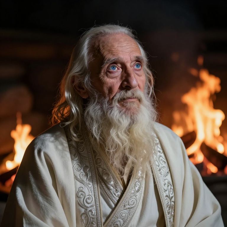 Craft a hyperrealistic portrait of an elderly sage with calm blue eyes, clad in flowing robes adorned with intricate silver embroidery. From a low angle, capture the profound wisdom and depth within those upward-gazing eyes, reflecting the fire's flickering light. The warm glow of the campfire illuminates the surroundings, casting long shadows that accentuate the sage's serene expression and subtle facial lines, creating an atmosphere of contemplation and insight.