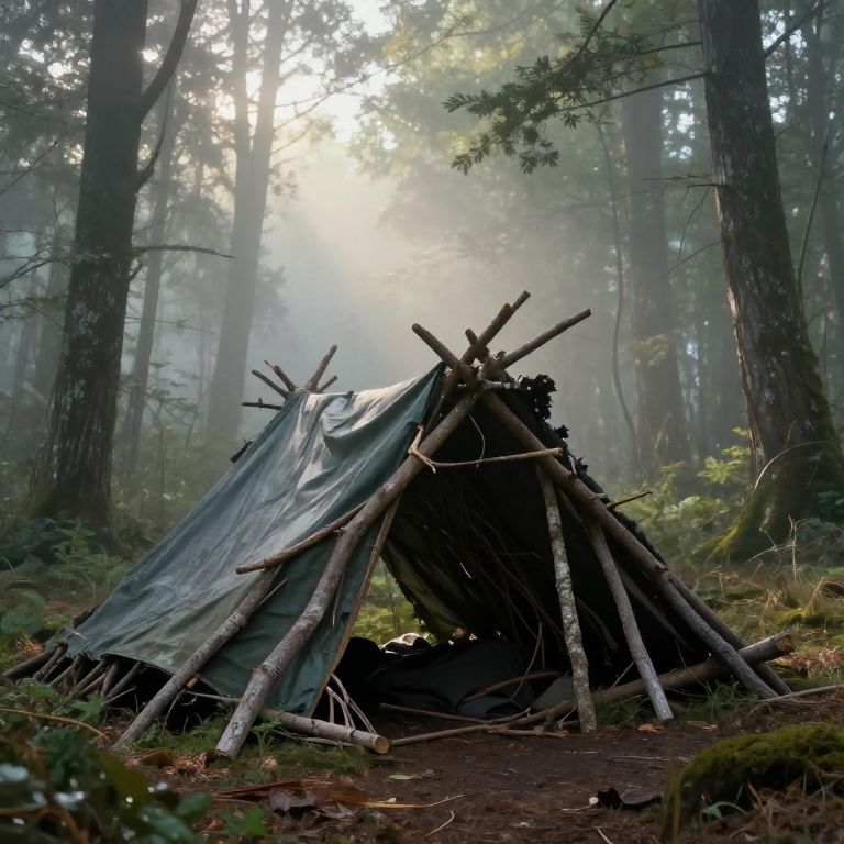 Photograph of a rustic wooden teepee shelter in a dense, misty forest. The shelter is made of sturdy, uneven wooden poles, with a green canvas tarp draped over the top, slightly sagging in the center. Sunlight filters through the tall trees in the background, creating a soft, ethereal glow. The forest floor is covered in moss, small plants, and a dirt path leads to the shelter. The scene evokes a sense of wilderness and primitive living. The image is rich in natural textures and colors, with a focus on the contrast between the dark wood and the green tarp against the misty, light-filled background.