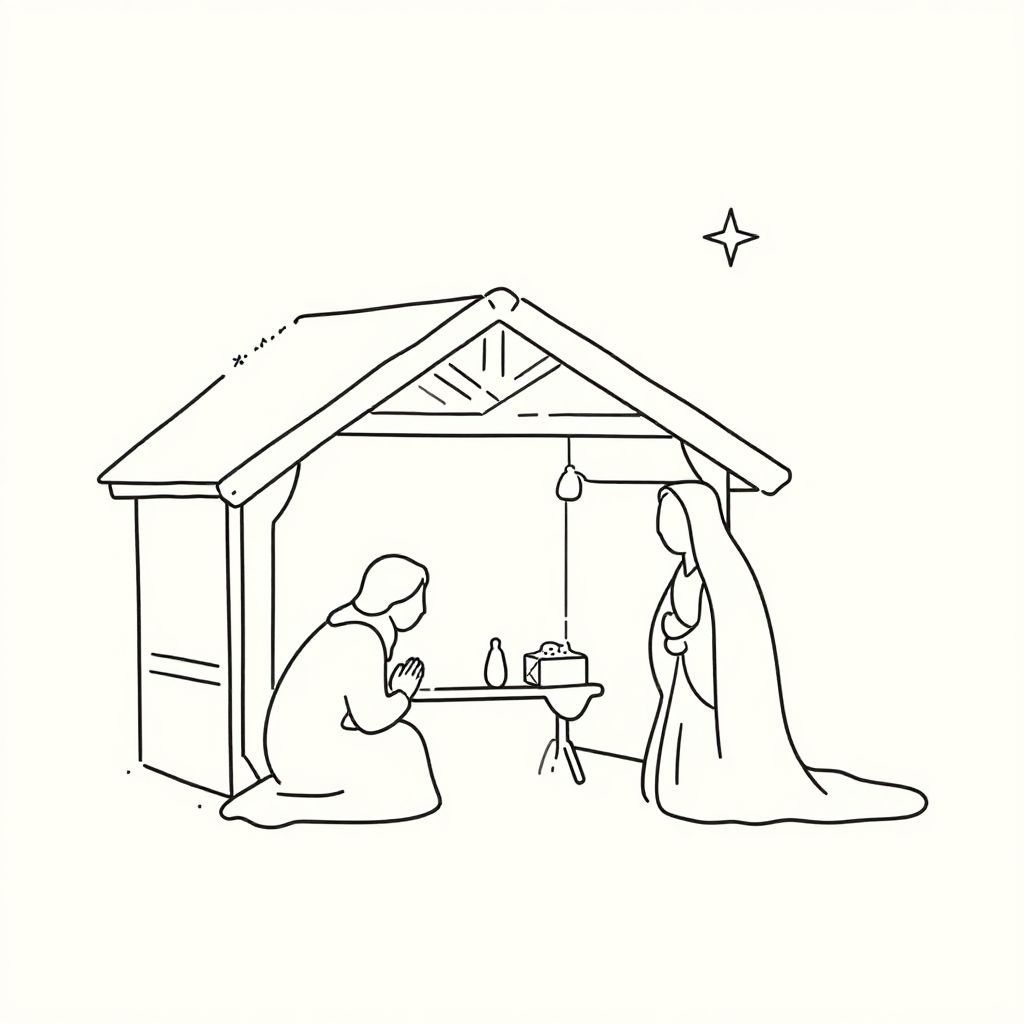 Nativity line art with star shining above stable, slender and sleek continuous lines illustrating the holy scene, a balanced minimalistic design capturing the essence of Christmas story, serene and elegant with ample negative space