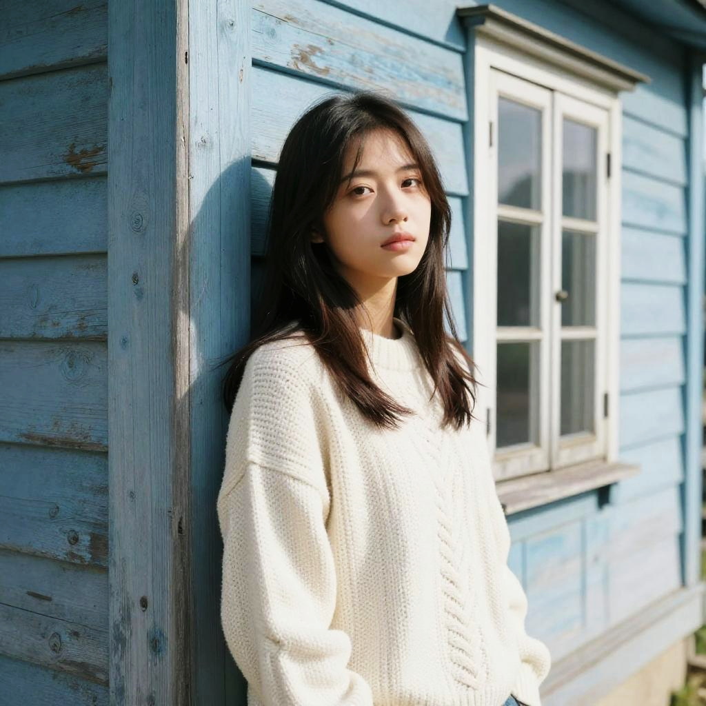 Photograph of an East Asian woman with long, straight black hair, wearing a white, chunky-knit sweater. She stands leaning against the weathered, blue wooden wall of a rustic building, with a white-framed window on the right. The sunlight casts a soft shadow, highlighting her serene expression and natural makeup. The blue wooden texture is slightly worn, adding a rustic charm to the scene. The background includes part of the building's exterior, which contrasts with her bright sweater. The overall mood is calm and introspective.