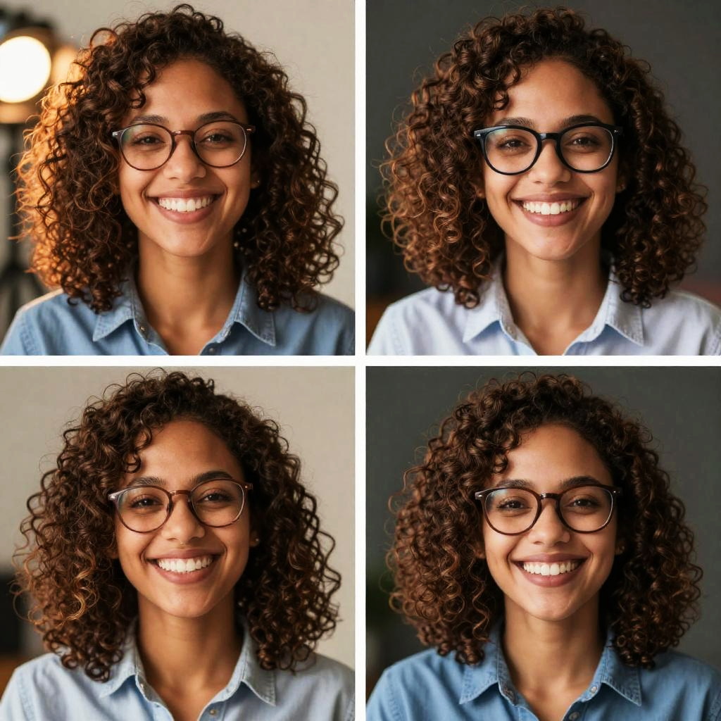 This is a digital composite of four close-up photographs of a smiling woman with curly, voluminous brown hair and glasses. She has a light brown skin tone and is wearing a collared shirt in different shades of blue. The background features warm, glowing light in some shots and darker, cooler tones in others, creating a dynamic contrast. Her expression is friendly and joyful in all images.
