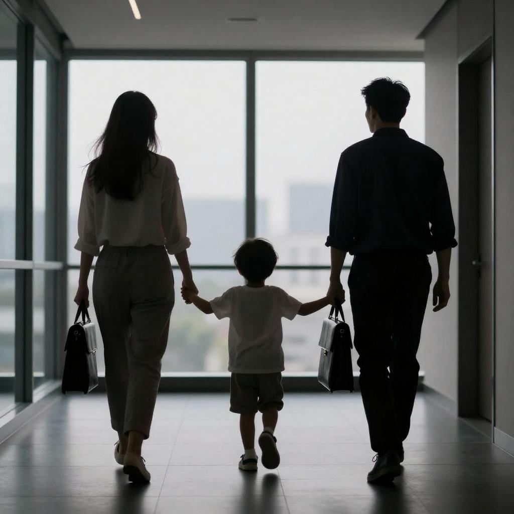 Silhouette of a family in a modern office hallway. Man and woman, both holding briefcases, and a child between them. Child's arm outstretched. Background: large window with cityscape. High-contrast lighting. Silhouettes against bright window.