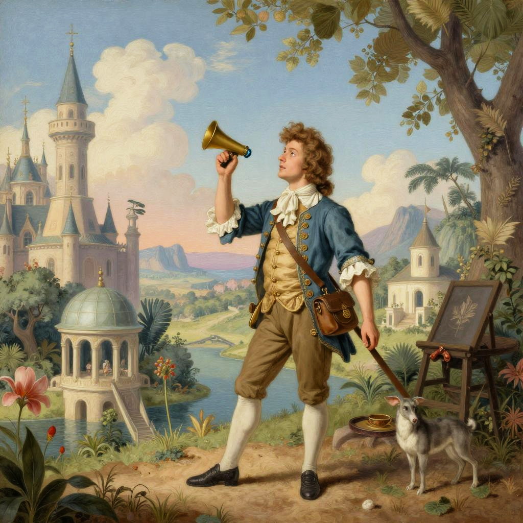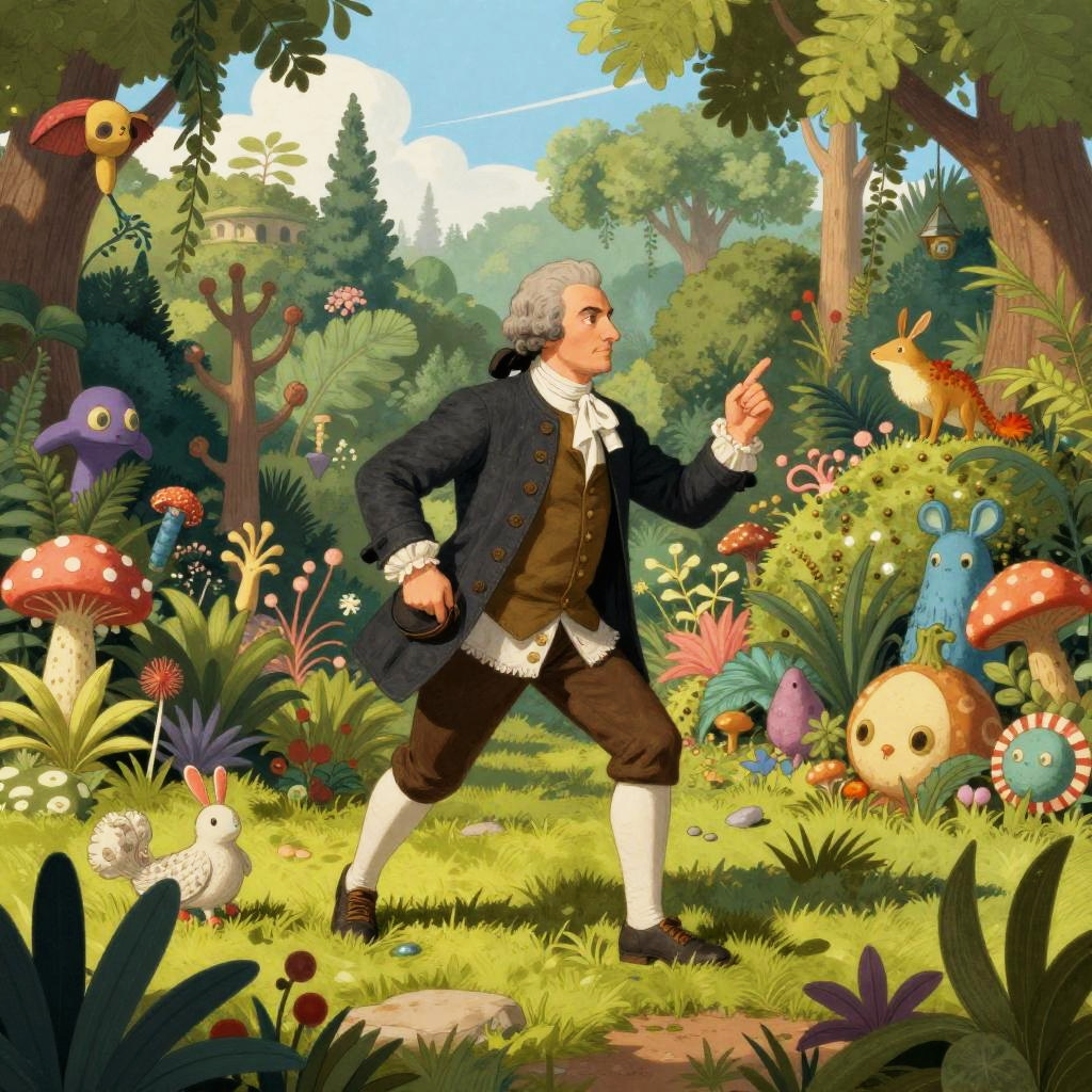 Candide exploring a lush, otherworldly garden filled with exotic plants and strange creatures, evoking Voltaire's satirical narrative, illustrated in a vivid, storybook style with dynamic composition and a bright, whimsical color scheme.