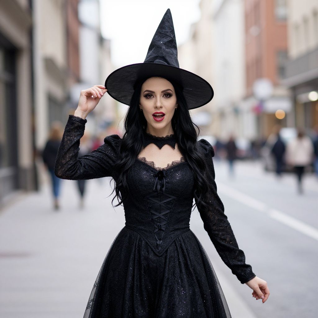 Photograph of a woman standing on a city street in a Halloween costume. She has long, wavy black hair and wears a large, pointed black witch hat. Her dress is black, long-sleeved, and lace-trimmed with a fitted bodice and a full, tulle skirt. Her makeup is dramatic, with dark eyeliner and red lipstick. She holds the brim of her hat with her right hand. The background is a blurred city street with buildings and a few pedestrians. The lighting is bright, highlighting her costume against the urban backdrop.