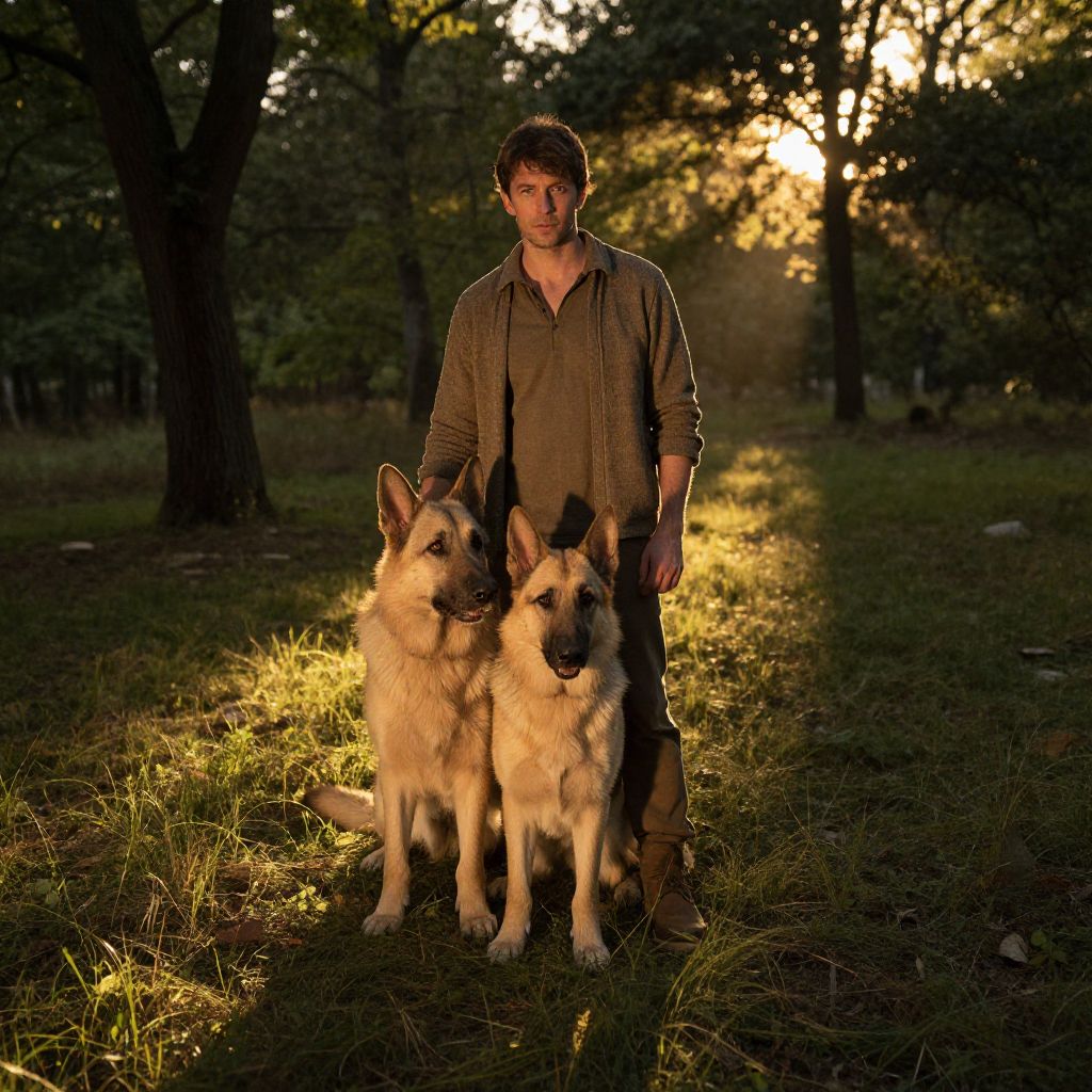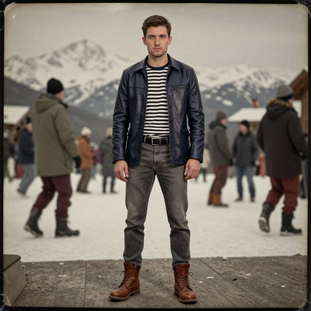 A man, olive green softshell jacket, dark gray padded ski bibs, cream merino wool t-shirt, black insulated winter boots, burgundy touchscreen gloves, lush gardens, whimsical fairy tale castles, collodion wet plate style, thoughtful expression Man has masculine face and piercing eyes