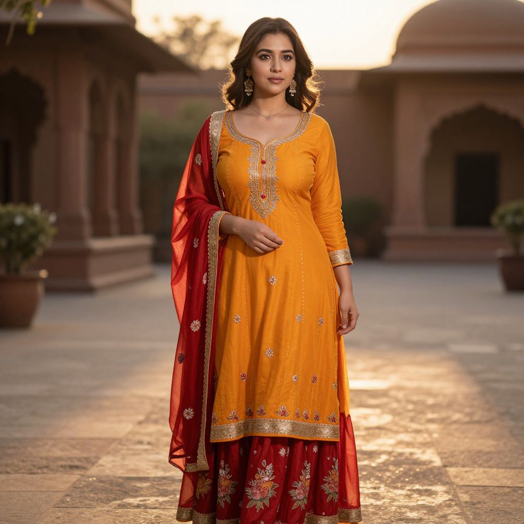 A stunning woman in her late 20s with warm brown skin, soft curvy features, and bright brown eyes wearing a traditional kameez ghagra costume, the kameez is a vibrant orange cotton fabric with golden embroidery, and the ghagra is a flowing red silk saree-style skirt with floral patterns, standing gracefully in a traditional Indian courtyard at sunset with soft golden light casting long shadows.. The woman has big tits and cute face