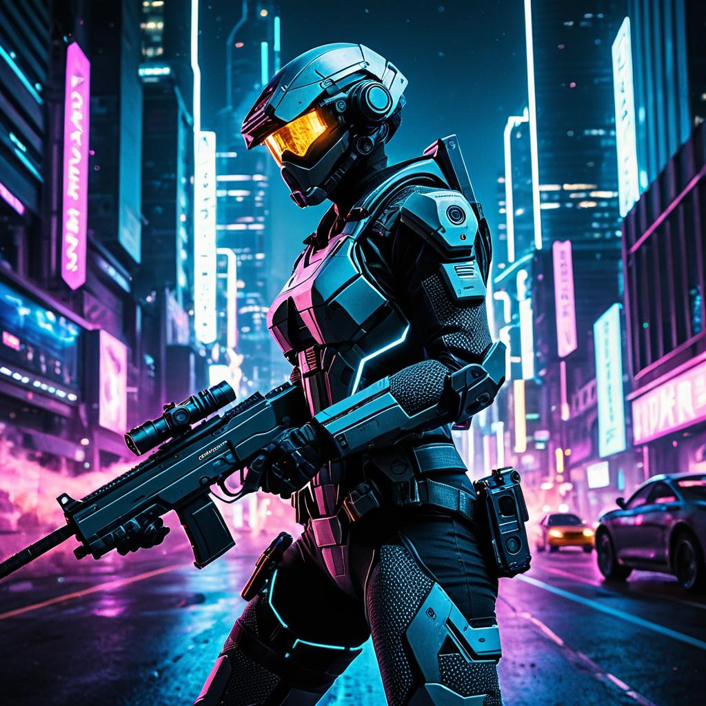Action-packed scene of a graceful female hacker, wearing a translucent neon data cloak. The composition includes cybernetic interfaces glowing and digital fragments shattering, blending Ghost in the Shell influences with dynamic futuristic technology in a highly detailed, hypermodern design.