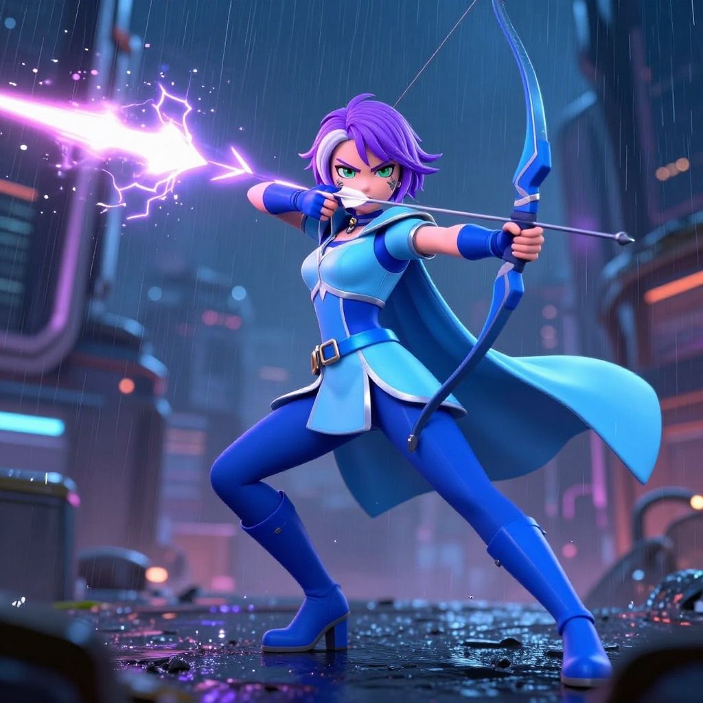 CGI digital art of a purple-haired archer in a blue outfit, firing a glowing arrow in a rainy, futuristic cityscape.