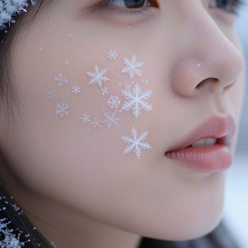 This photograph features a close-up of an Asian woman's face, focusing on her right cheek and partially visible lips. Her light, smooth skin is adorned with delicate, white, snowflake patterns that appear to be digitally added. The snowflakes vary in size and are scattered across her cheek. Her dark hair is slightly visible in the background, and the lighting is soft, creating a gentle contrast with the white snowflakes. The background is blurred, emphasizing the intricate details of the snowflakes and the texture of her skin. The image has a cold, wintery feel, despite being an indoor photograph.