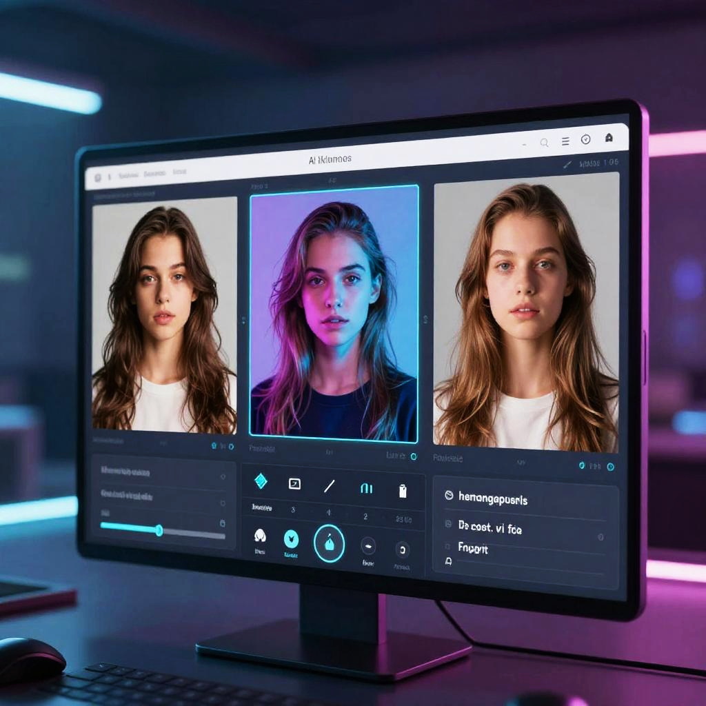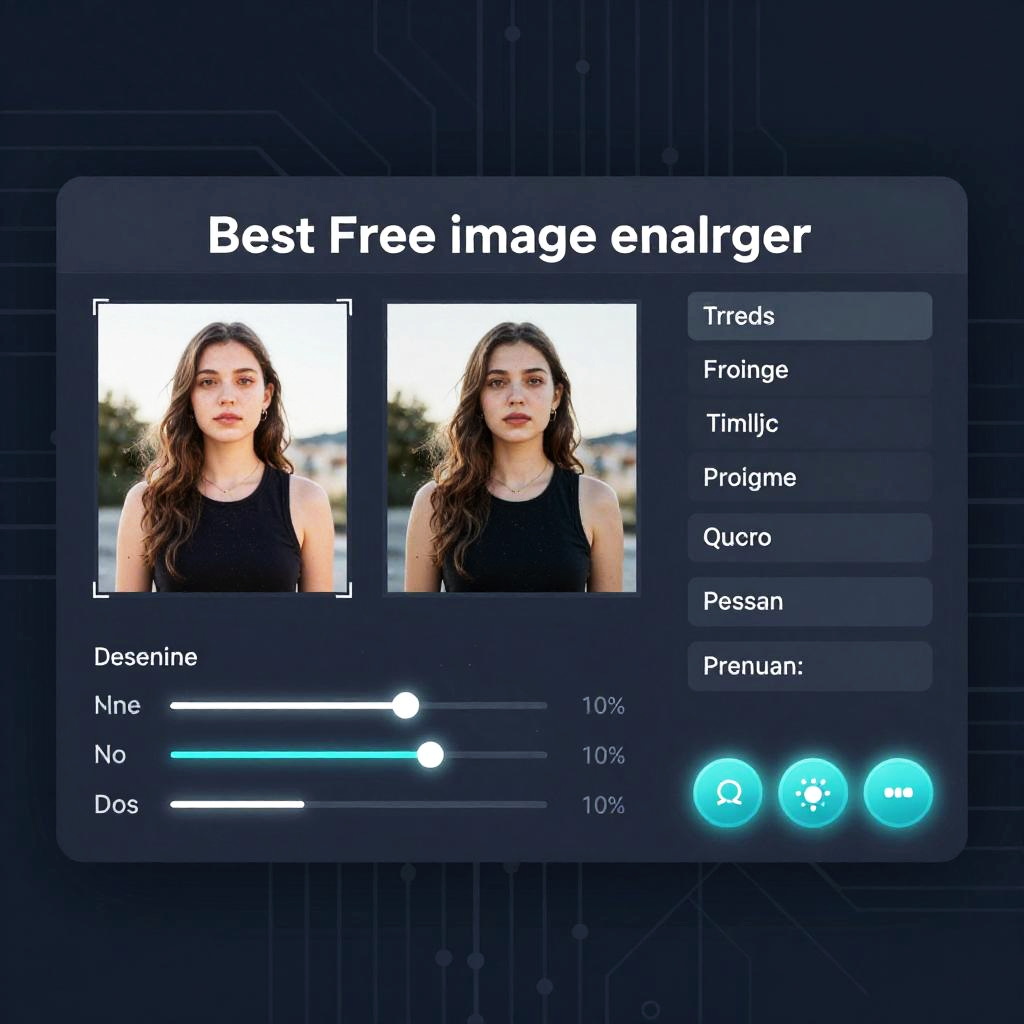 Illustration of the best free image enlarger software interface with a digital canvas showcasing various image resolutions, sliders and buttons glowing gently, futuristic background with circuit board patterns, emphasizing precision, clarity, and ease of use in digital image processing.